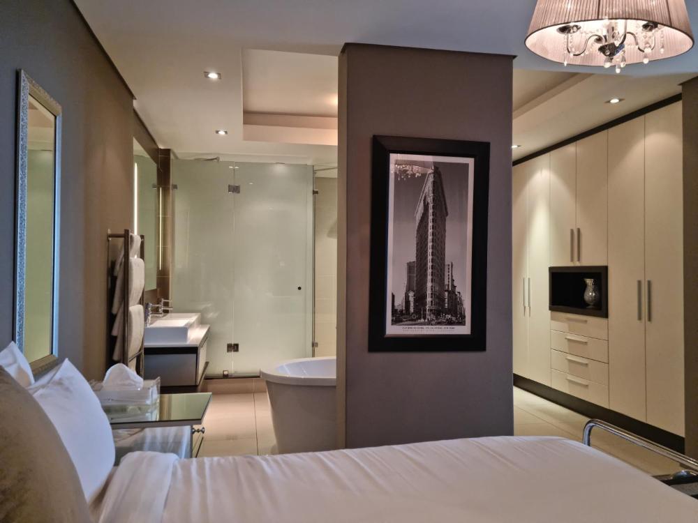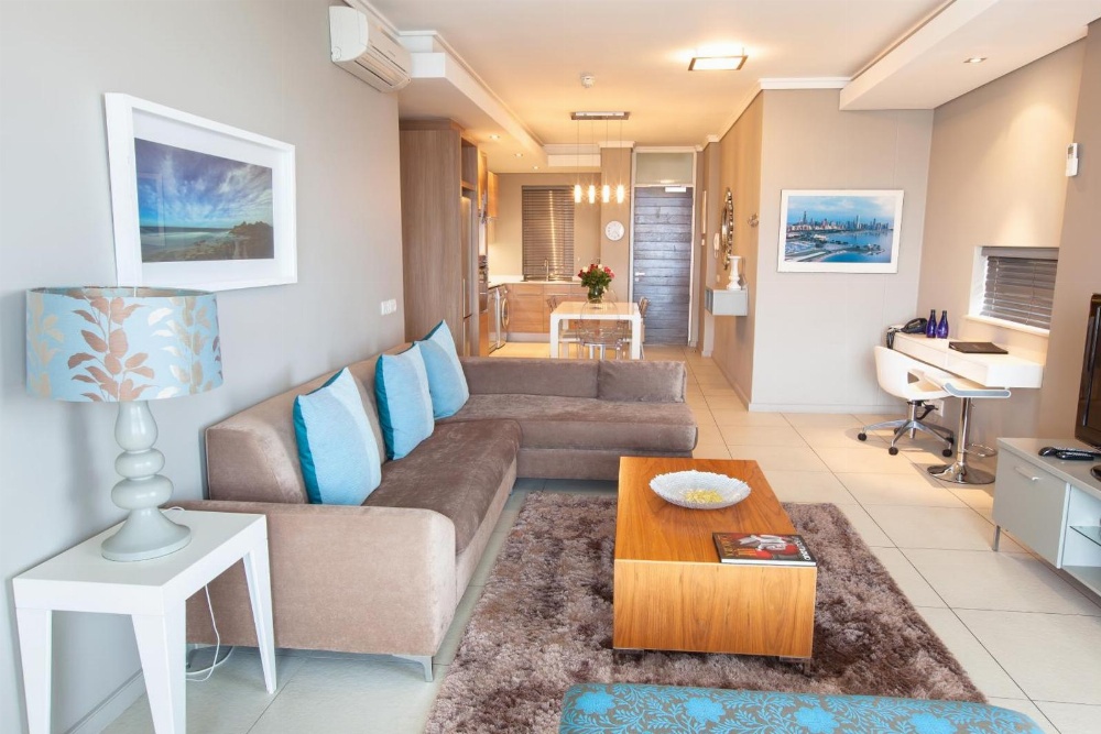 This modern apartment features a balcony. It has a fully equipped kitchen and separate lounge/dining area with a flat-screen TV.